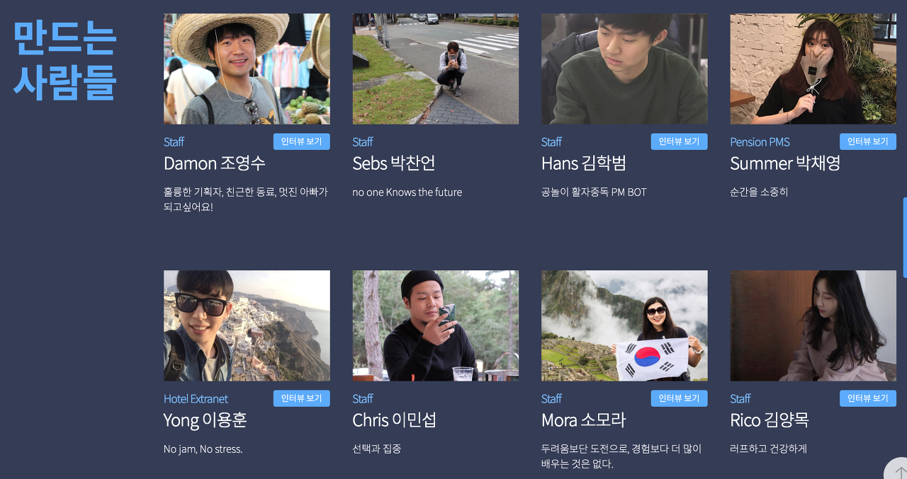 현재 저희 ONDA의 기획자는 저 포함 5명입니다. 저희는 영어 이름을 사용하는데 Yong과 Summer는 티몬에서 2년 넘게 MD 업무를 담당하다 기획자로 전향했고, Hans는 개발 PM업무와 운영 업무를 병행하다가 기획자로, Sebs도 전공은 기획자가 아니었지만 이전 회사에서 우연히 기획업무를 담당하게 되었고 이후 저희 회사로 이직하게 되었습니다.
