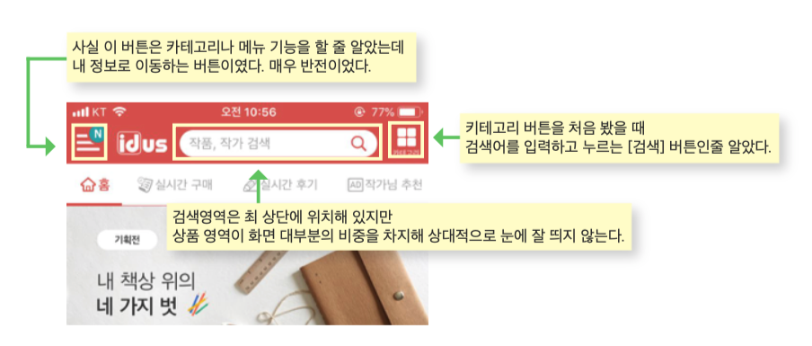 우선 아이디어스를 스터디 주제로 선정한 이유는 아이디어스가 가지고 있는 상품 대비 앱이 효율적이지 못하다고 생각이 되었다. 사람의 첫인상이 중요하듯 어떠한 서비스나 특정 서비스가 아닐지라도 모든 것의 첫 모습은 매우 중요한 부분이다. 이 부분에서 아이디어스의 메인 화면은 효율적이지 못하다고 생각된다. 그 이유를 자세하게 풀어보겠다.