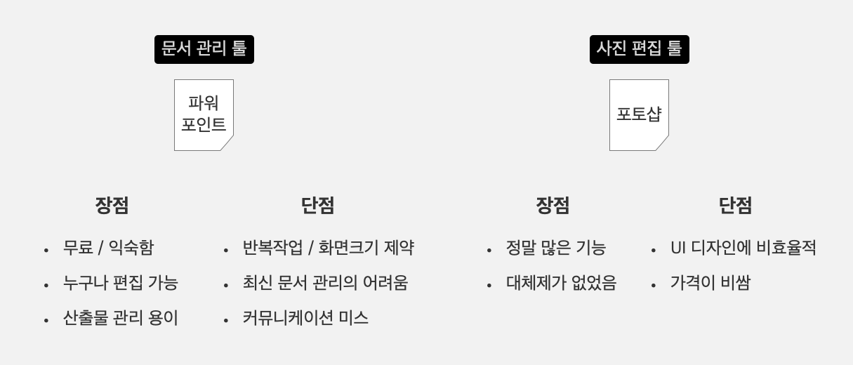 단점으로는 태생이 문서 편집 툴이다 보니 UI 설계를 진행함에 있어서 비효율적인 부분도 많고 반복 작업도 많이 발생합니다. 화면 크기에 제약이 있다 보니 페이지가 길어지면 다음 페이지로 넘기거나 한 화면에 억지로 욱여넣게 되는데 이러한 과정에서 시각적 왜곡이 발생하고 직관적으로 전달하기에 어려움이 있습니다. 또한 최신 버전 관리에도 어려움이 있는데요. 개발자, 디자이너, 기획자가 바라보는 문서의 버전이 다른 경우도 발생합니다. 이러한 여러 가지 이유로 커뮤니케이션 미스가 발생하기도 하죠.