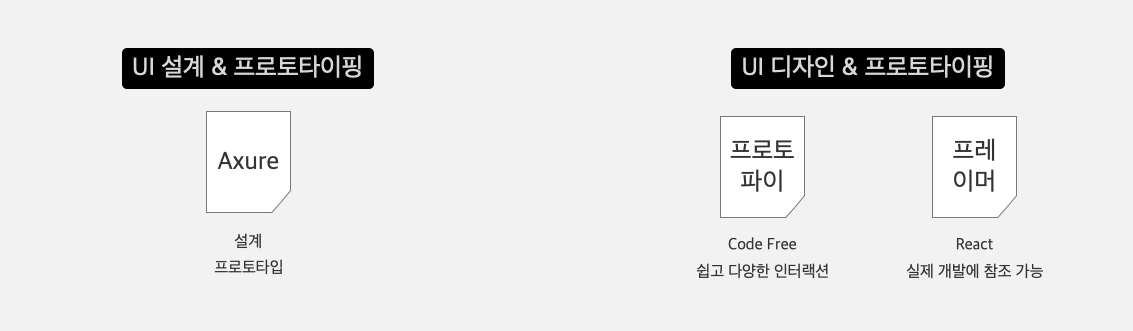 전문 프로토타이핑 툴로는 Axure, ProtoPie, Framer가 있습니다. 위에서 언급한 디자인 툴 3종도 프로토타입 제작을 위한 인터랙션 기능을 지원하지만 전체 인터랙션의 20~30% 정도의 간단한 인터랙션만 지원하고 있습니다.