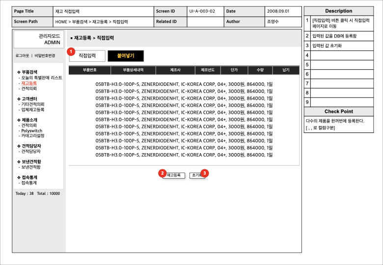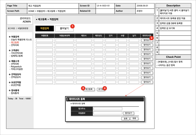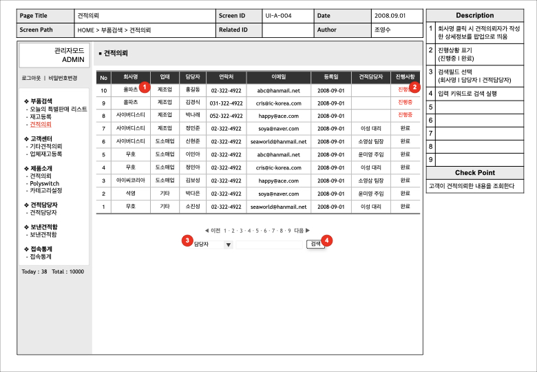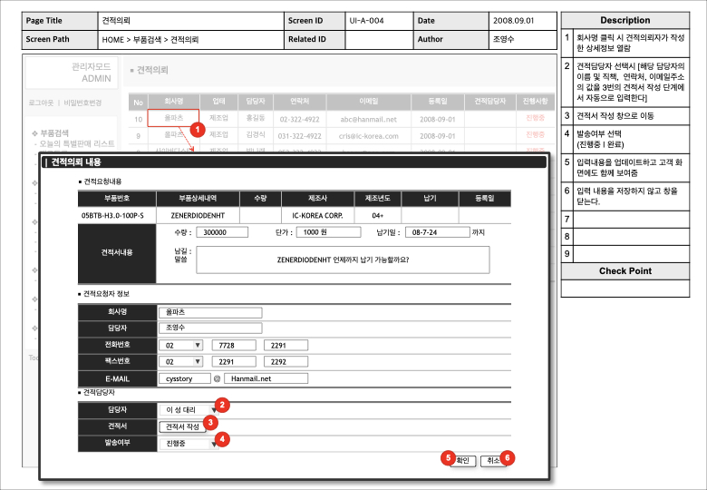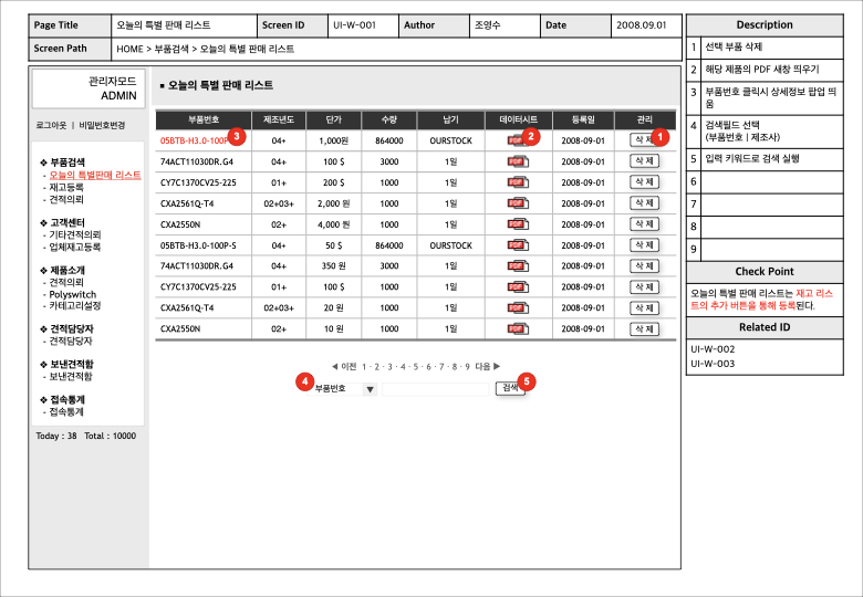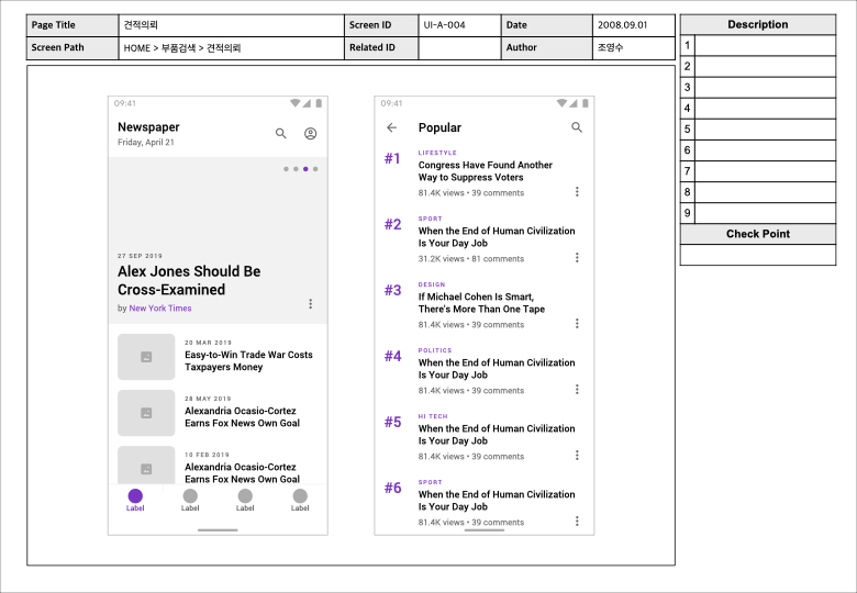 UI 설계 화면은 이미 익숙하실 거라 생각합니다. 상단 영역에는 화면 목록에서 정리한 내용을 담고, 왼쪽 영역에는 UI를, 우측 영역에는 각 번호에 해당하는 디스크립션을 정리합니다. 디스크립션 작성 팁 중 하나는 아래 화면처럼 [Description], [Check Point], [Related ID]와 같이 성격에 따라 영역을 구분하면 좀 더 깔끔하게 정리할 수 있습니다. 모바일 설계도 같은 방식으로 진행하면 됩니다.