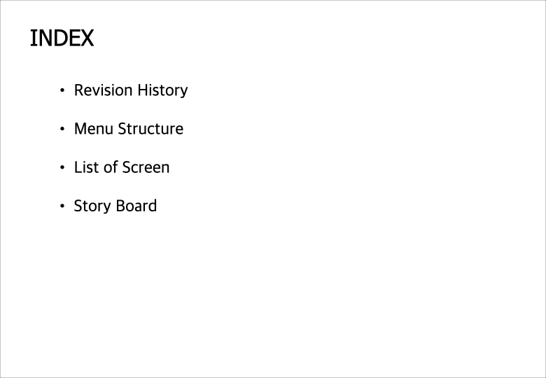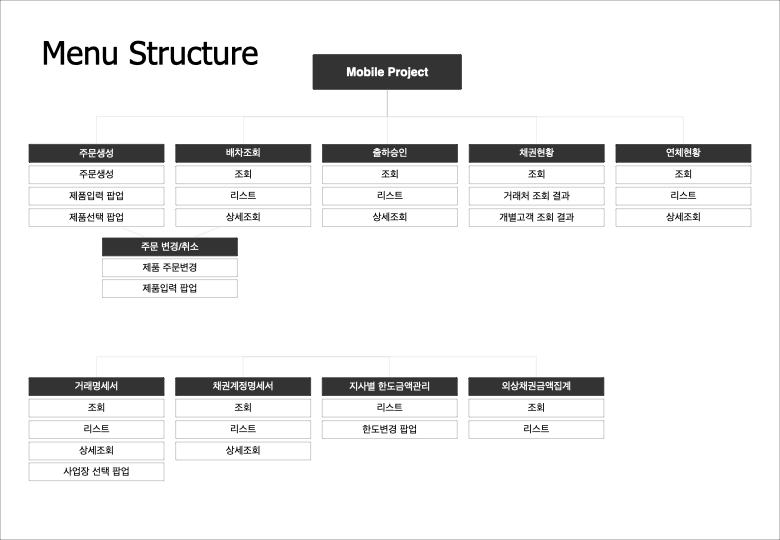 제품의 전체 구조를 시각화합니다. 설계 문서를 여럿이 작업하는 경우에는 메뉴 기준으로 업무 범위를 나눌 수도 있고, 문서 양이 많은 경우에도 메뉴 구조별로 쪼개면 나중에 취합하기에도 좋습니다.