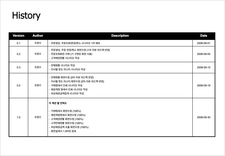 현재 문서의 버전과 히스토리를 정리합니다. 개발자들은 깃허브를 통해 그동안의 코드 변경내용을 상세히 알 수 있지만, 파워포인트 문서는 파일로 주고받다 보니 서로의 버전이 꼬일 수도 있고 변경내용을 추적하기가 어렵습니다. 그렇기 때문에 문서 앞부분에는 그동안의 변경내용과 문서 버전을 꼭 기록해야 합니다.