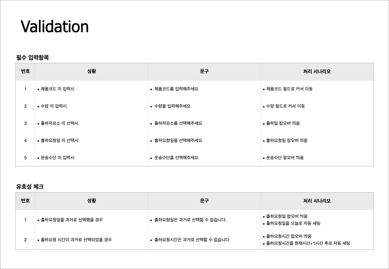 설계를 하다 보면 [필수 입력항목]과 [유효성 체크] 시나리오도 정리해야 하는데 우측 공간이 너무 좁은 경우에는 디스크립션을 작성하기가 불편합니다. 이 때는 별도 페이지로 분리해서 아래 화면처럼 [상황, 문구, 처리 시나리오]를 표로 만들어서 정리하면 작성하기도 쉽고 개발자들이 보기에도 훨씬 좋습니다 ^^