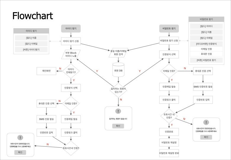 한 가지 팁을 드리면 [비밀번호 찾기] 우측의 화면처럼 해당 페이지에서 필요한 필드 값을 함께 정리해두면 뒤에서 UI를 그릴 때 큰 고민 없이 바로 시작할 수 있습니다. 또한 얼럿 메시지도 눈에 띄게 표현해주면 좋습니다.