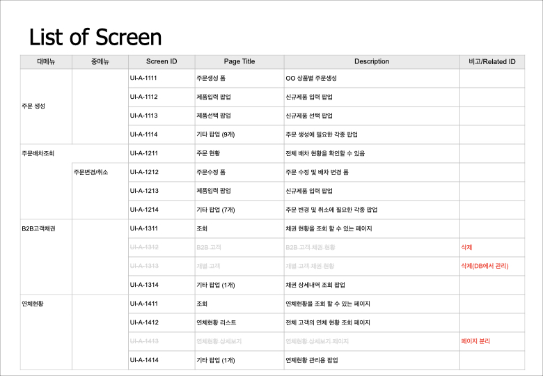 문서에 담긴 화면 목록을 정리합니다. IA(InformationArchitecture)와 비슷하다고 보면 되는데 개발자와의 커뮤니케이션을 위해 Screen ID를 표기하기도 합니다. 맨 우측 열에는 페이지별 참고사항을 정리하는데 페이지가 삭제되거나 분리되었을 때 해당 행을 완전히 삭제하기보다는 아래 화면처럼 취소선과 비고를 적절히 활용하면 전체 히스토리를 파악할 수 있어서 좋습니다.