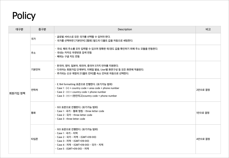 플로우차트와 정책은 세트로 묶어서 한 흐름에 이어가면 좋습니다. 플로우차트에서 담지 못한 내용은 정책 문서로 따로 분리해서 각 항목에 대한 고민사항과 결정사항을 정리합니다.