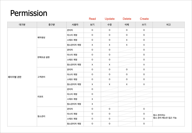 프로젝트 성격에 따라 권한 설계가 필요한 경우도 있고 불필요한 경우도 있습니다. 아래 화면은 권한 정책에 대한 예시인데요. 행은 [페이지]와 [사용자 그룹]으로 쪼개고, 열은 [CRUD]로 쪼개면 한눈에 들어와서 보기 좋습니다. 페이지에 따라 특정 기능을 사용할 수 없는 경우에는 명확하게 Block처리를 해주면 좋습니다.
