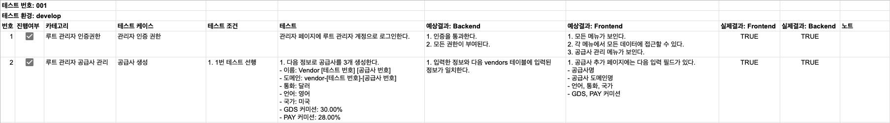 번호 / 테스트 진행여부 / 카테고리 / 테스트 케이스 / 테스트 조건 / 테스트 / 예상결과: Backend / 예상결과: Frontend / 실제결과: Fronted / 실제결과: Backend / 노트 순서로 구성되어 있습니다.