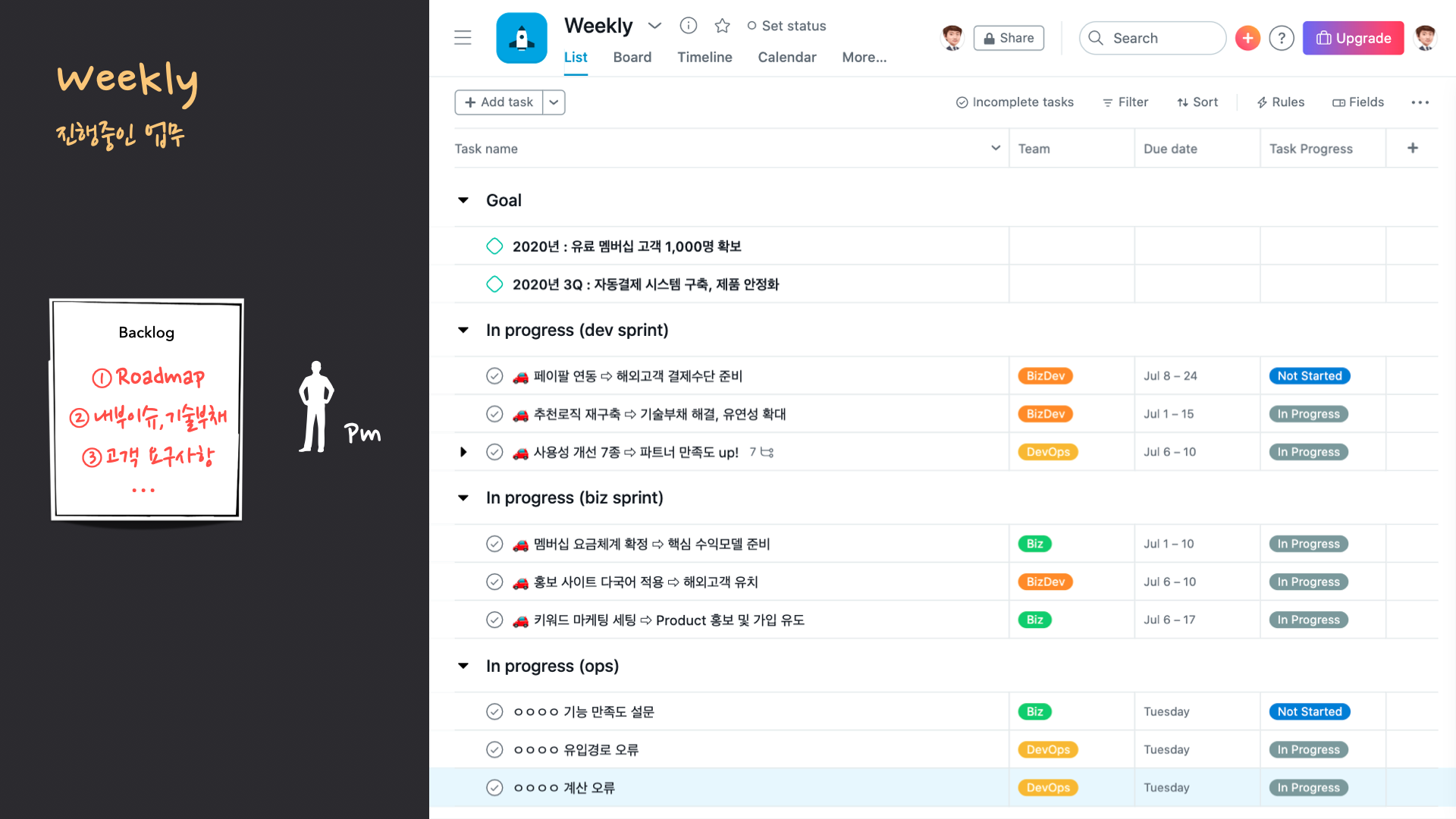 애자일 조직에서 많은 회사들이 JIRA로 Task를 관리하고 Confluence를 wiki로 이용하지만, 저희는 Asana로 Task를 관리하고 Notion을 wiki로 사용하고 있습니다. 오늘은 저희 팀이 아사나로 Task 관리하는 방법을 소개해보겠습니다.