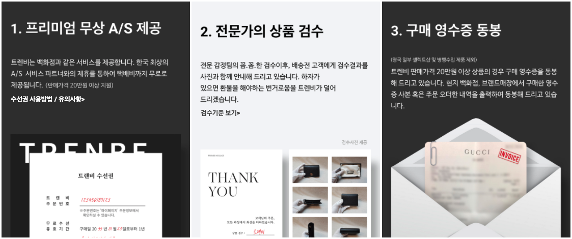 해외 구매대행을 통해 상품을 구매하게 되면 이 제품이 정품이 맞는지, 하자가 있는지, 국내에서 A/S가 가능한지 걱정될 수 있습니다. 그래서 트렌비는 고객이 상품을 받아보기 전에 전문가가 직접 상품을 검수하고 검수 결과를 안내해줍니다. 또한 20만 원 이상의 상품은 국내에서도 백화점과 동일한 수준의 A/S 서비스를 제공한다고 합니다. 택배비도 무료!