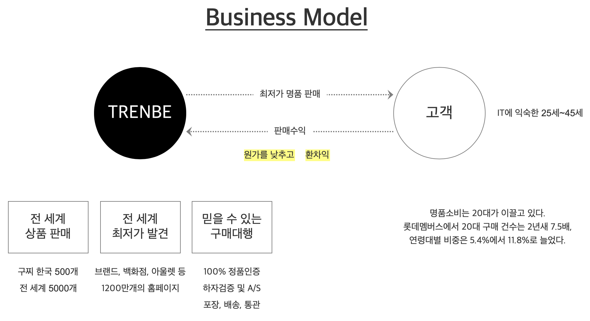 명품 시장 트렌드를 보면 기존에는 30~40대가 주요 고객이었는데, 최근에는 20대 고객이 빠르게 성장하고 있다고 합니다. 롯데멤버스 리포트에 따르면 최근 2년 새 20대 구매 건수가 7.5배 증가했고 연령대별 비중도 5.4%에서 11.8%로 늘었다고 하는데요. 트렌비는 IT에 익숙한 25세~45세 성인을 타깃으로 삼고 있기 때문에 앞으로도 좋은 성장을 만들어낼 거라 기대됩니다.