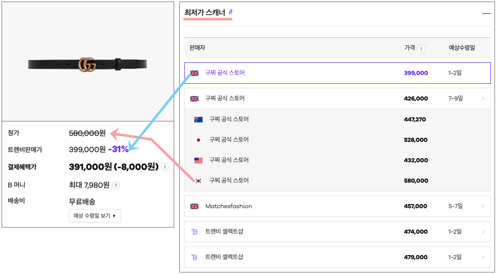 이미지 우측의 최저가 스캐너를 보면 동일한 상품이어도 판매하는 스토어에 따라 가격에 차이가 발생합니다. 이 제품은 한국 스토어는 580,000원, 일본 스토어는 528,000원, 영국 스토어는 399,000원으로 동일한 제품이어도 공식 판매가에서 181,000원의 차이가 발생합니다.