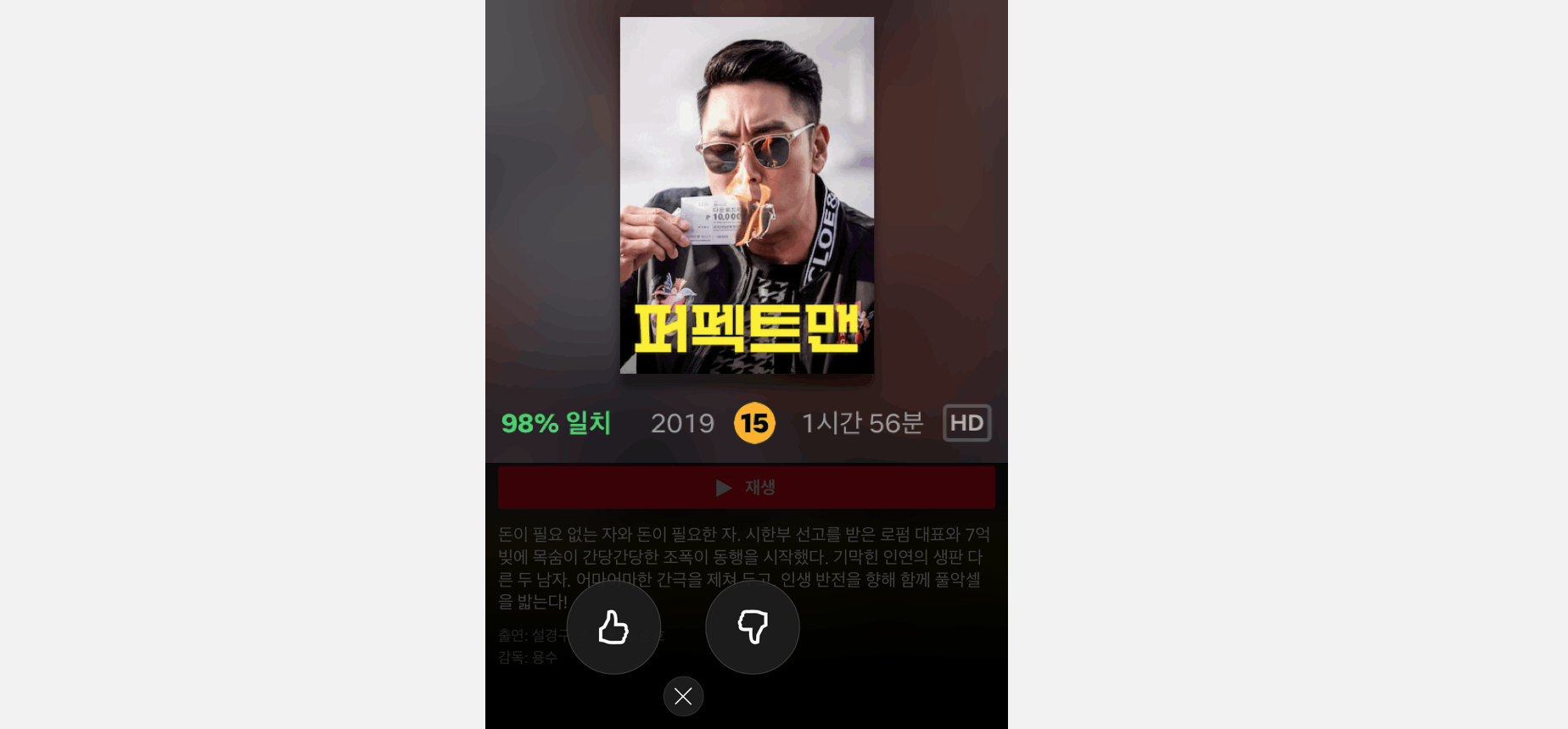 1점~5점으로 영화를 평가하는 별점 평가 시스템도 폐지했습니다. 배경은 유명 평론가나 지인이 높은 점수를 주었을 때 내가 생각하는 별점을 주지 않고 제삼자의 관점에서 객관적으로 영화 품질을 평가해 오차가 발생한다는 점을 문제점으로 인식했고 이를 대체하기 위해 좋아요, 싫어요 두 가지 기준으로 평가제도를 개편했습니다. 평가제도 개편 후 평가 활동은 두 배 이상 늘었고 현재는 고객 시청기록과 좋아요, 싫어요 평가를 바탕으로 영화를 추천하고 사용자가 얼마나 좋아할지 예측하는 매치 지수를 숫자로 보여주고 있습니다.