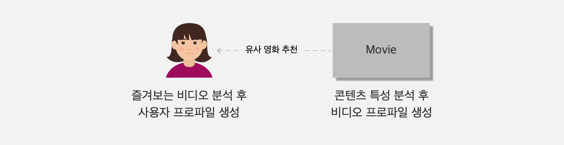 영화 타이틀을 기준으로 배우, 장르, 국가, 시대, 연령대 등 수백 개의 영화 특성을 분석해 영화 프로파일을 생성하고, 타깃 사용자가 좋아한 영화를 바탕으로 사용자 프로파일을 도출합니다. 그리고 영화 프로파일과 사용자 프로파일을 비교해서 사용자 선호 영화를 추천하는 방식입니다.