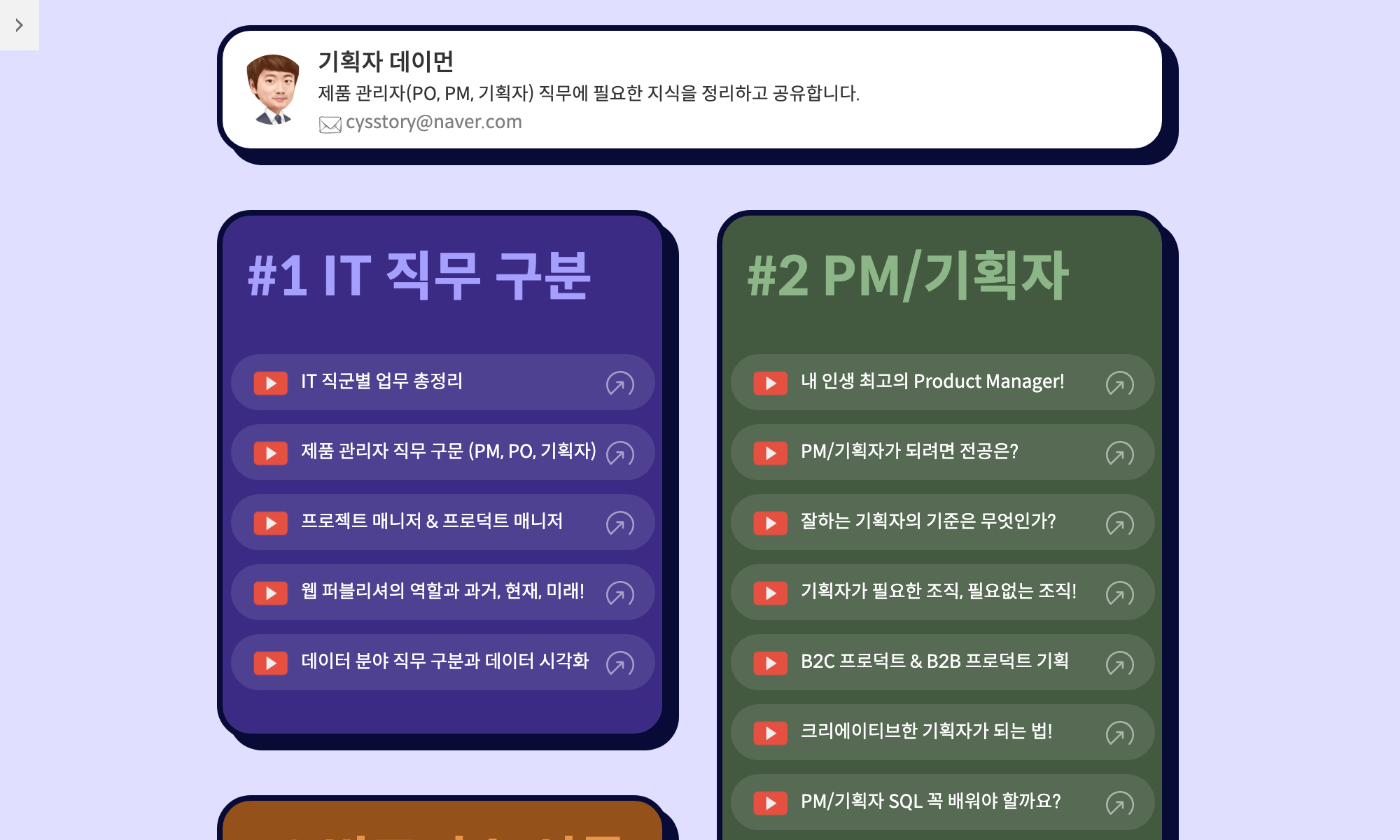 그동안 유튜브에 틈틈이 업로드한 영상을 모아서 PM/기획자 Guide 페이지를 만들었습니다.