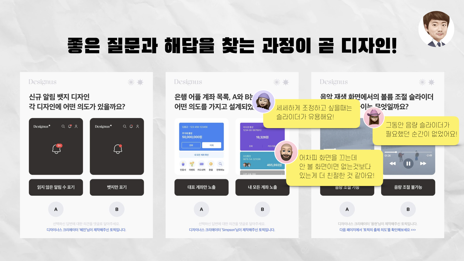 인스타그램 채널로 운영된다는 것이 특징적인데요. 아래 이미지와 같이 디자이너들이 한 번쯤은 고민해봤을 질문들이 꾸준히 올라오고 그에 대해 여러 사람들의 다양한 의견들이 달리는 컨셉입니다.