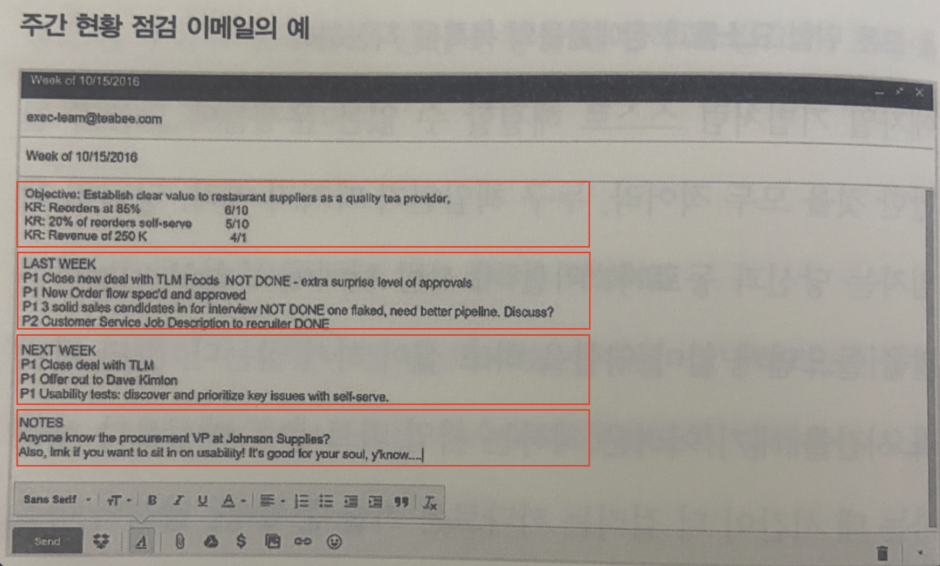 OKR 섹션에서 가장 인상깊은 항목은 KR 달성 여부에 대한 자신감 점수를 10점 기준에 5점 (50%)로 정하고 트래킹 한다는 내용이다. 매주 진행상황을 점검하며 자신감 점수가 올라갔는지, 내려갔는지를 점수로 표기하고 그 이유를 논의한다.